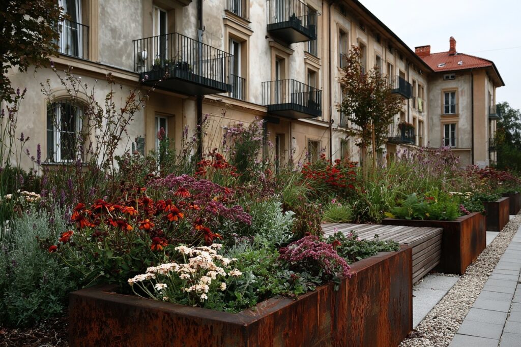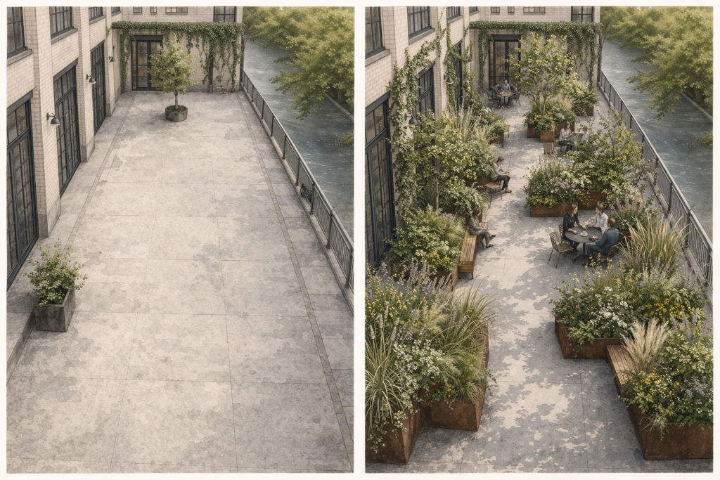 Mitarbeitende brauchen Pausen – am liebsten draußen, an einem Ort der wirklich einlädt. Ich gestalte Innenhöfe, Terrassen und Eingangsbereiche so, dass sie mehr werden als graue Fläche: ein Ort zum Durchatmen, der nebenbei auch Wildbienen und Schmetterlinge anzieht.